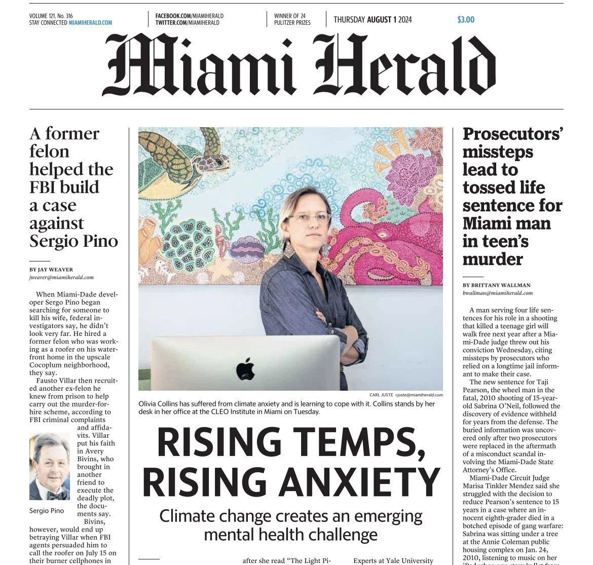 Painting Seascape featured on the front page of The Miami Herald print edition in 2024, installed as a site-specific artwork at the CLEO Institute headquarters within the Center for Social Change.